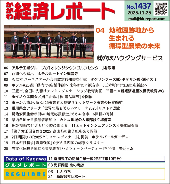 旧さぬき北幼稚園(さぬき市鴨庄)の跡地に開設したのは、魚の養殖と植物栽培を掛け合わせた、革新的な循環型農法「アクアポニックス」を用いた『あなぶきさぬき市鴨庄プラント』。高品質イチゴの水耕栽培とコチョウザメの陸上養殖という高付加価値の組み合わせ。地域の遊休資産を未来産業へ転換する取り組みで、新たな地方創生モデルとして期待される。