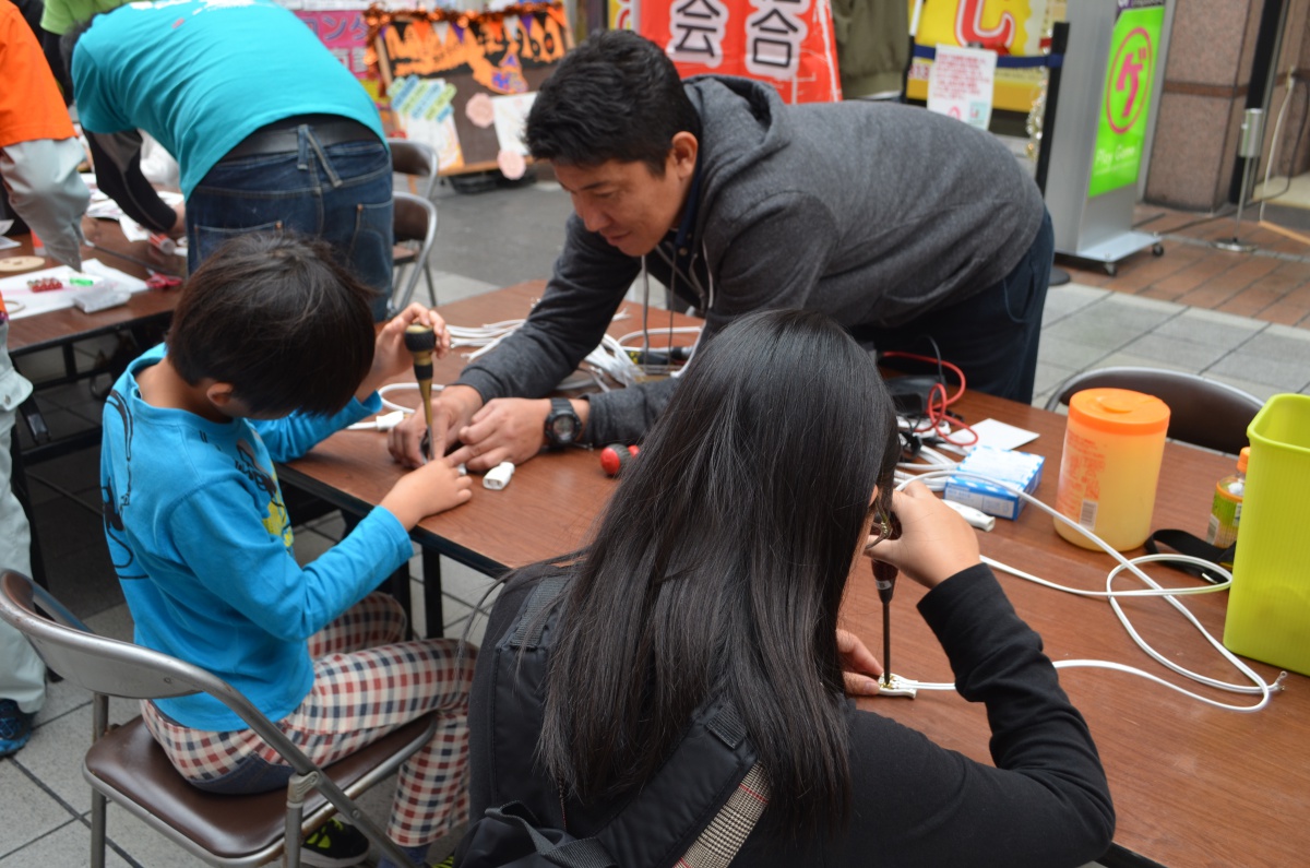 和太鼓演奏で幕を開けるとともに、同会に加盟する中小企業組合ら14団体が通路にブースを設けて出展。「なにあれ〜」と興味津々で駆け寄った子どもたちは、工具を使って延長コード、水道管をベースにした楽器づくりなどに挑戦。ドライバーを駆使してコードを完成させた女の子(小学3年生)は、「苦労したけど、なんとかうまくできた」と満足げに話し、ものづくりの難しさ、大切さを学んだ様子だった。